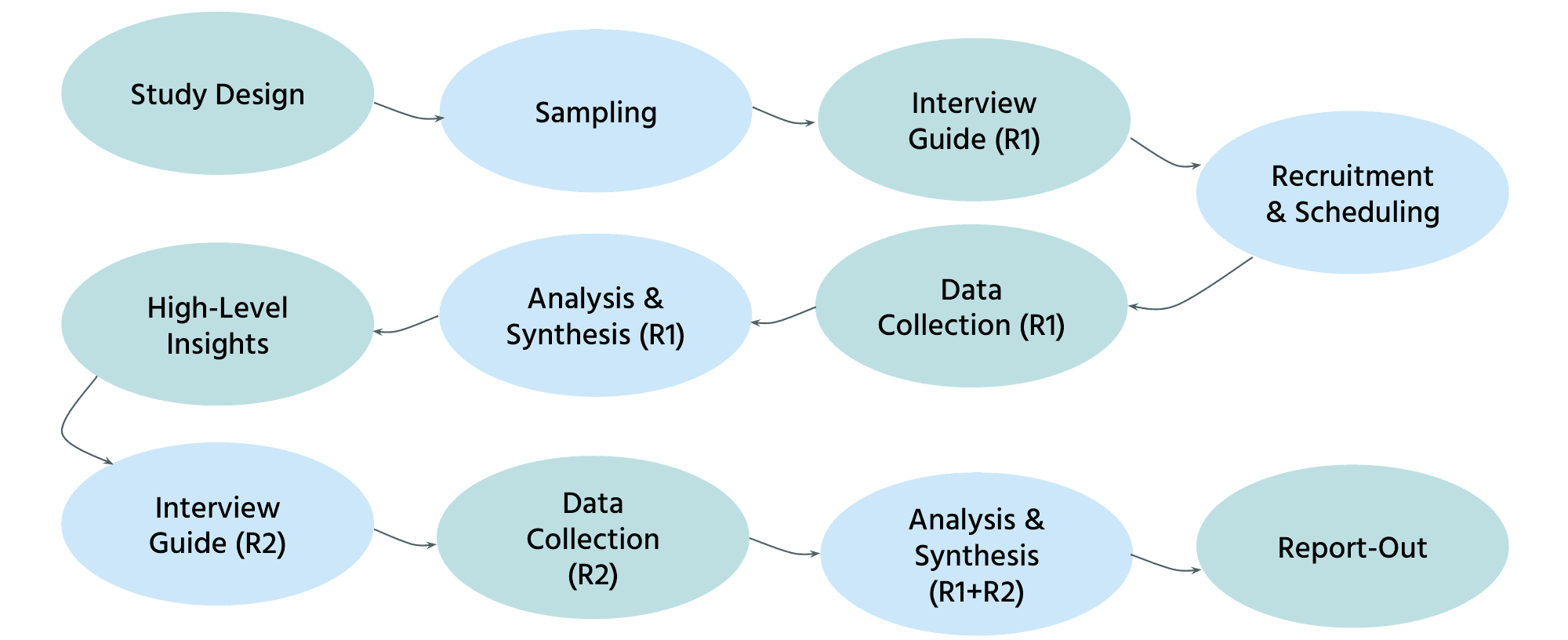 Uniquely, I conducted two rounds of in-depth interviewing. The first round of interviews was loosely structured and truly exploratory, because I did not know what participants would say (e.g., what kinds of data they looked at). In order to reach saturation and identify themes, I then conducted a second round of interviews focused on a discrete, limited set of topics across all participants. Both rounds focused on understanding both the users (e.g., roles, responsibilities, overall pain points) and their use of data (e.g., data tasks, sources, motivations, follow-up actions).