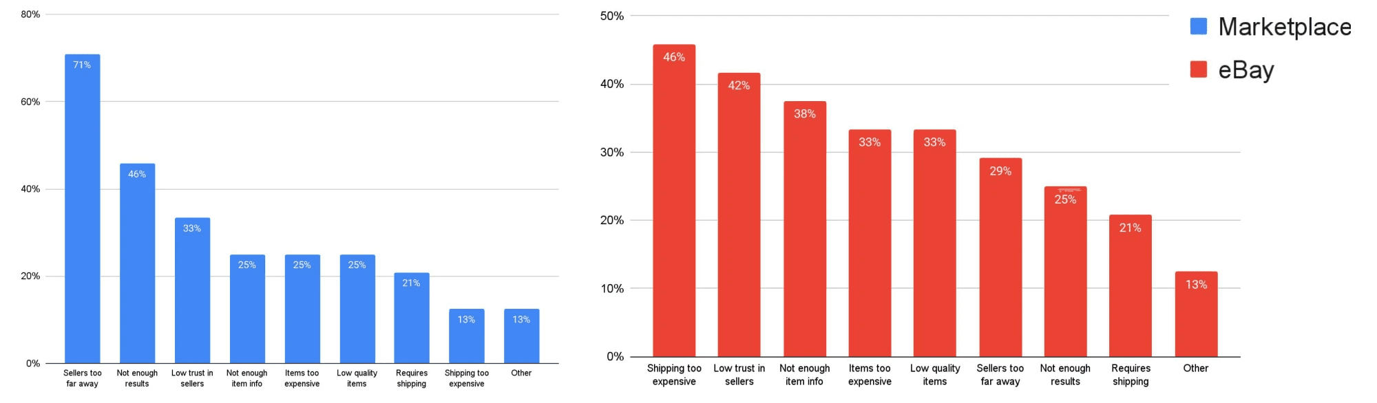 Low trust in sellers was a top barrier to finding items of interest on both Marketplace and eBay. Other top barriers were sellers being too far away and lack of search results (Marketplace) and high shipping costs and lack of item information (eBay).